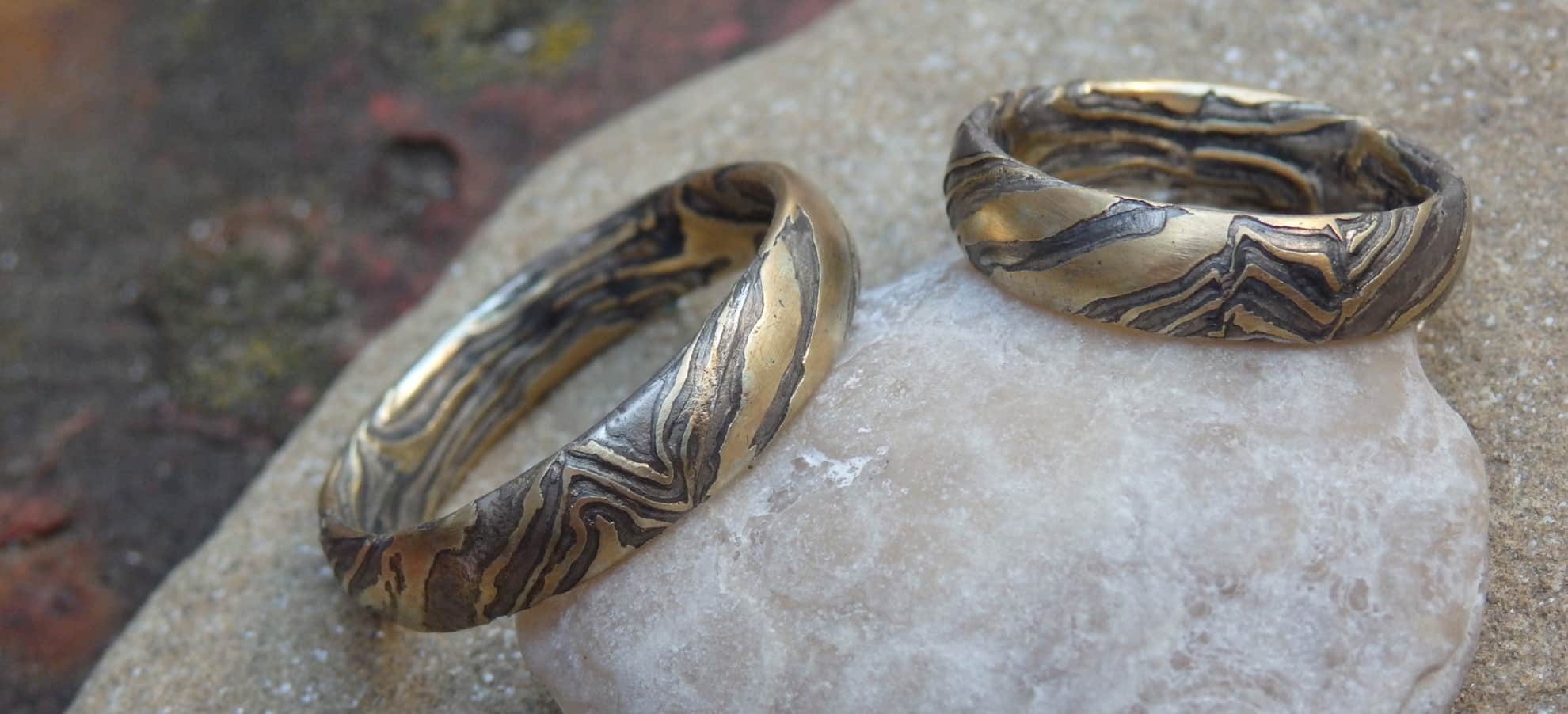 Meine Kollektion umfasst unterschiedlichste Schmuckdesigns, die Sie in aller Ruhe im Shop begutachten können: von schlichten Schmuckstücken, mit Stein ausgestattet, mattiert geschliffen oder poliert bis hin zu sehr ungewöhnlichen Techniken – so vielfältig wie das Mokume Gane. Die traditionsreiche Schmiedekunst, die ihren Ursprung im Japan des 17. Jahrhunderts hat, verleiht den Schmuckstücken eine geheimnisvolle Aura und eine einzigartige Optik. Kein Ring sieht aus wie der andere, keinen Armreif gibt es ein zweites Mal. Die Besonderheit der Mokume-Gane-Schätze liegt in den faszinierenden Mustern, die durch die Verwendung unterschiedlicher Edelmetalle entstehen und an natürliche Maserungen erinnern. Diese machen jedes Stück in meinem Goldschmiede-Onlineshop zu einem Unikat.