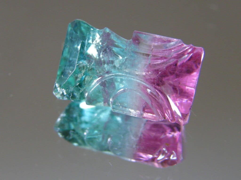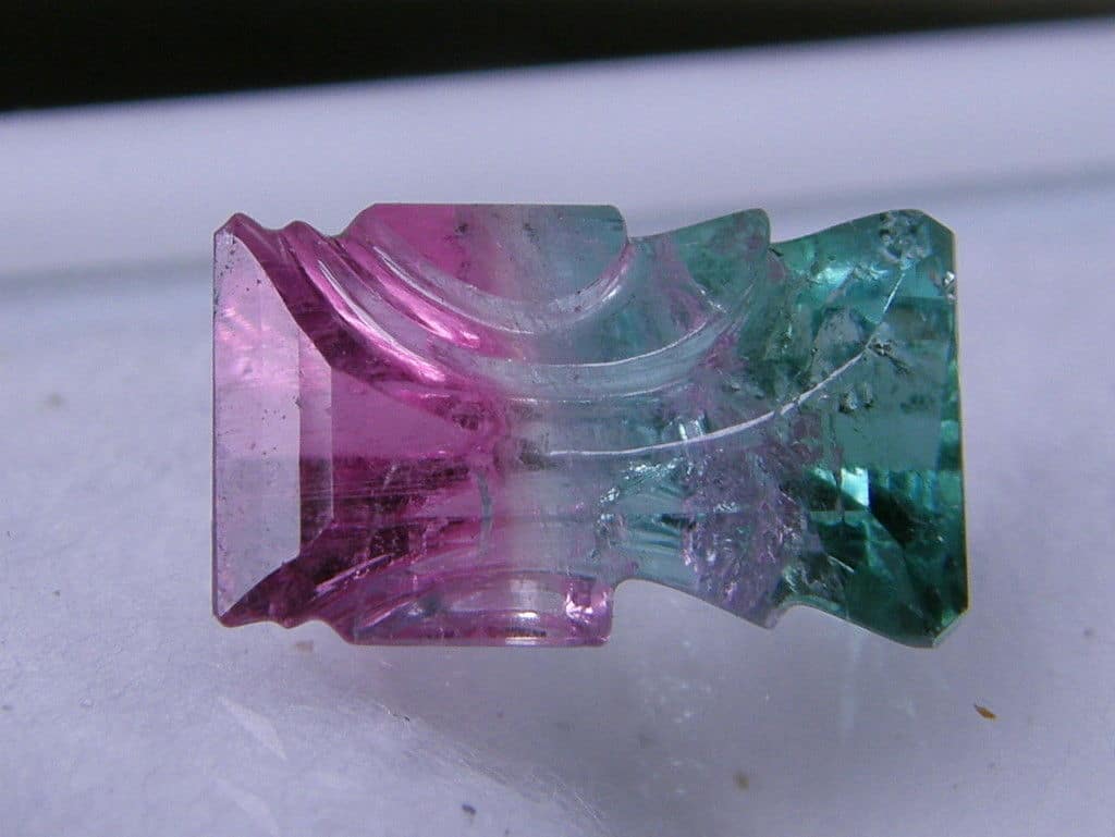 Turmalin Steinskulptur Anzahl : 1 Herkunft : Brasilien Schliff : graviertes Baguette , künstlerische Steinskulptur Grösse 7,2 x 12 mm Gewicht : 3,89 ct Farbe : pink und petrol bicolor – irre Farben Reinheit : klar mit wenig Einschlüssen Zur Schmuckherstellung oder als Sammlerstein geeignet Es handelt sich um einen echten natürlichen Edelstein , keine Synthese ! Damit Sie sich ein besseres Bild machen können sind die Abbildungen zum Teil vergrössert dargestellt. Von den hier eventuell sichtbaren Staubpartikel oder Fingerabdrücken ist bei Augenschein nichts zu erkennen |