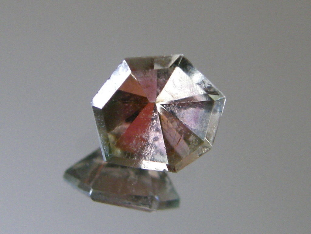 Turmalin Kristall-Endstück (Kristallspitze) Anzahl : 1 Herkunft : Brasilien Schliff : Spiegelschliff facettiert 7-Eck Die Winkel der Facetten sind durch die natürliche Kristallform gebildet Durchmesser 6 mm Gewicht : 0,76 ct Farbe : rot-grün Reinheit : Sehr klar keine mit blossem Auge sichtbare Einschlüsse Ein ganz besonderer Ringstein , auch als Sammlerstein geeignet Es handelt sich um einen echten natürlich gewachsenen Stein , keine Synthese ! es wird der abgebildete Stein versteigert ! |
