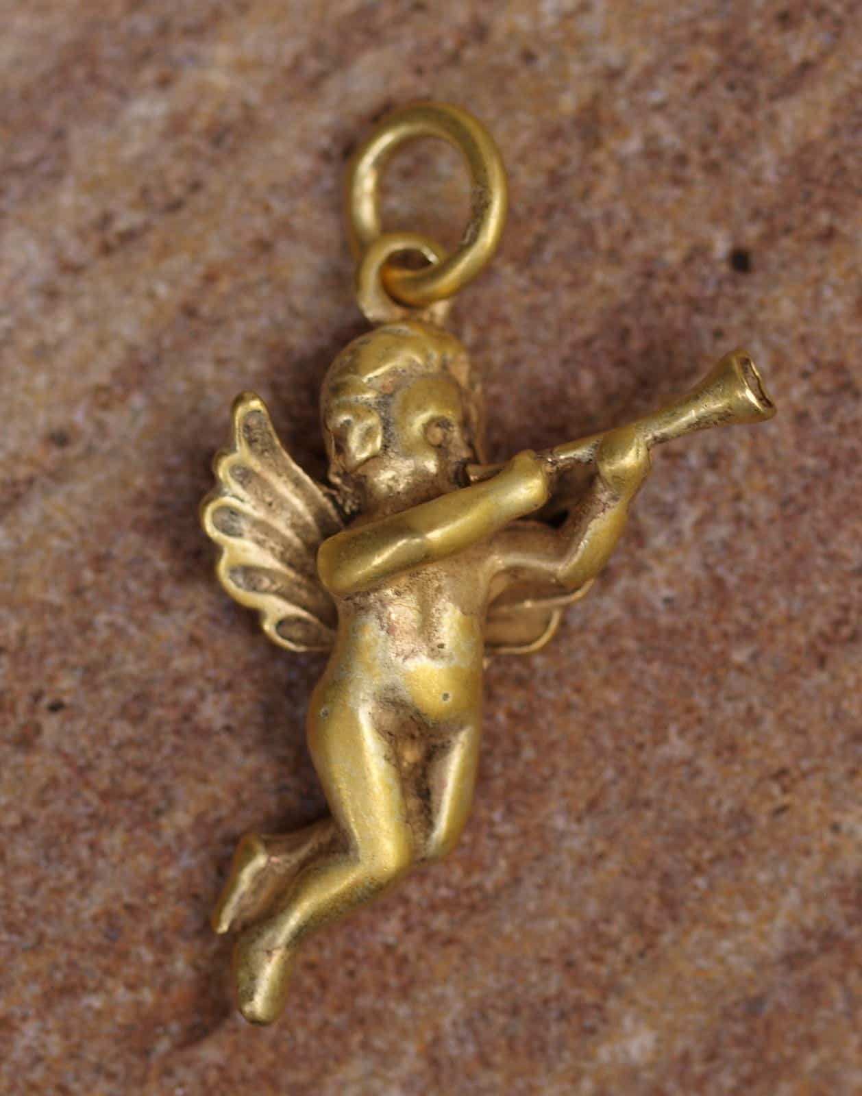 Kleiner Gott mit Posaune als Anhänger in Silber 925 vergoldet. Er hat die Maße 7 x 16 x 29 mm Gesamtgewicht 3,6 g Der Anhänger ist massiv vollplastisch gearbeitet. Er kann auch als Schutzengel agetragen werden! Ganz niedlich.