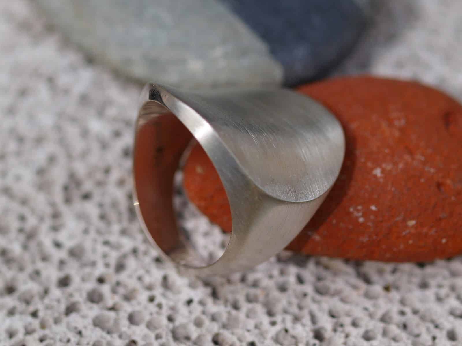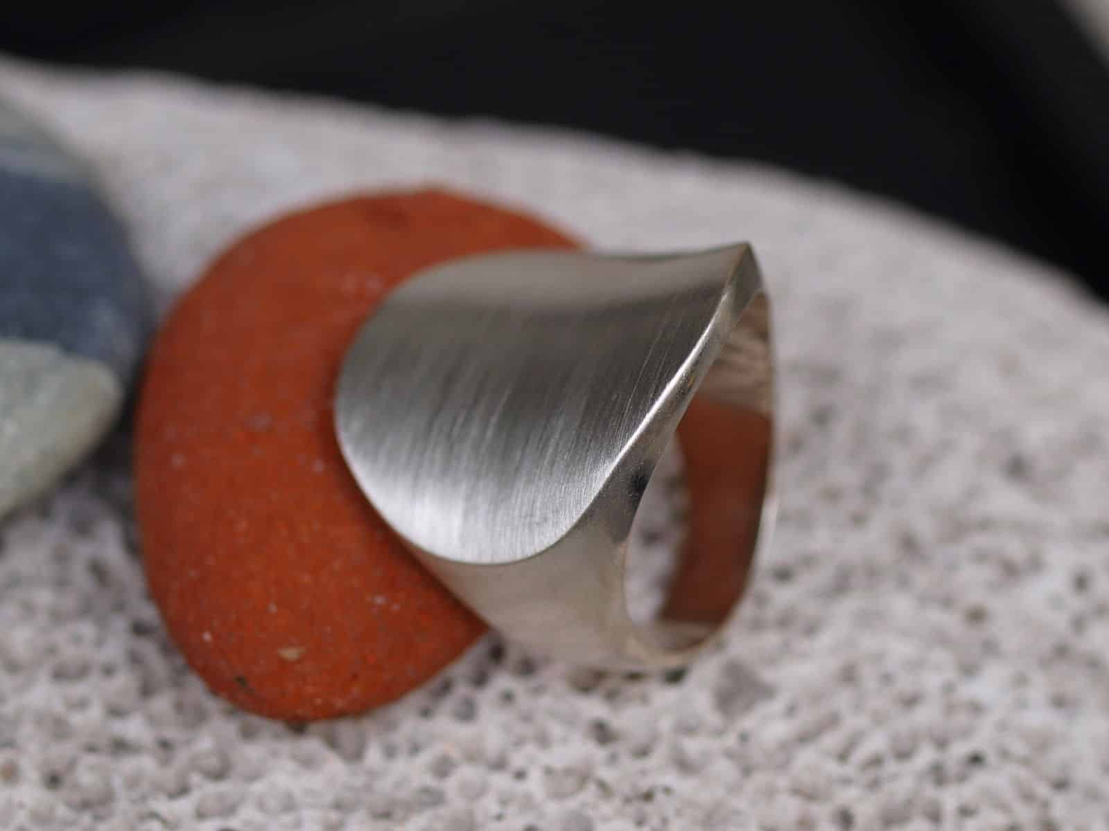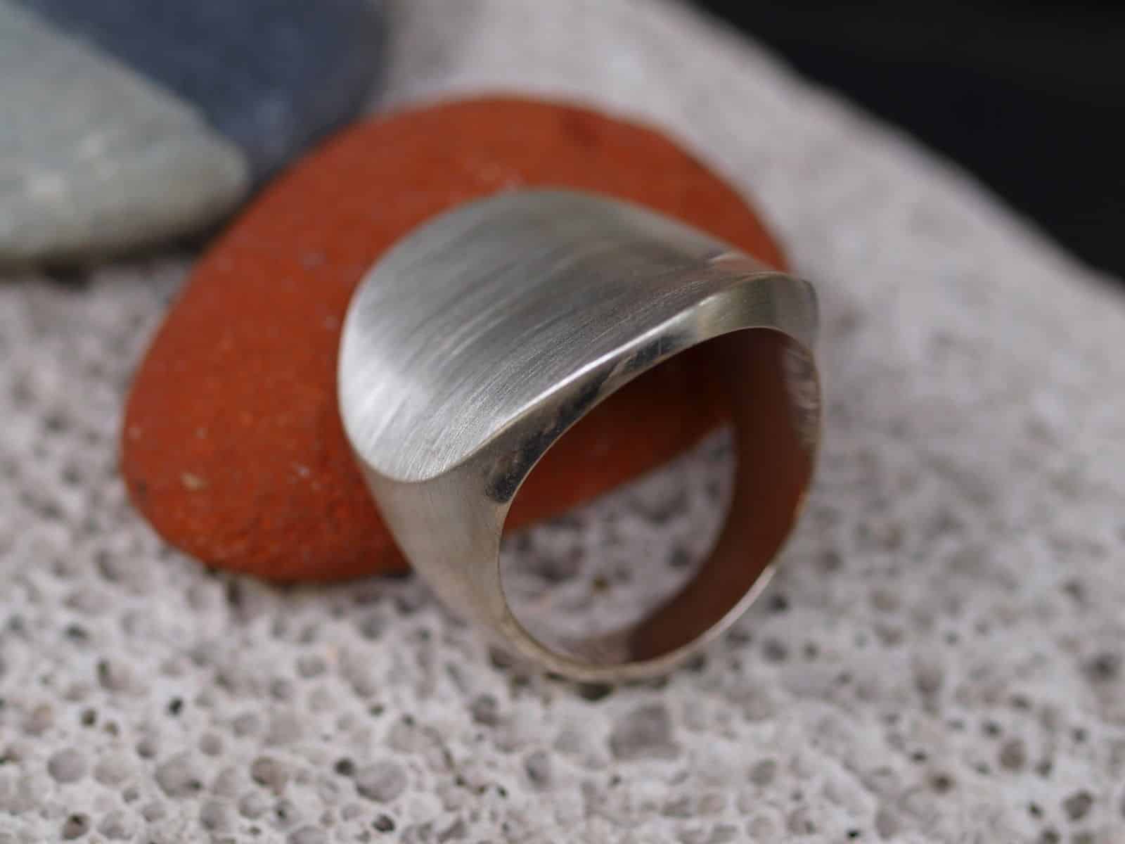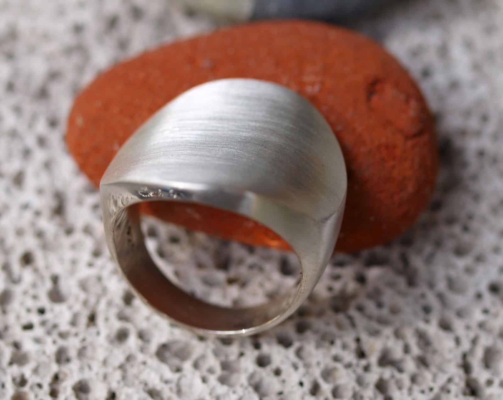 Dieser Designerring in modernem Design besticht durch seine schlichte Form. Der Ring ist sehr massiv in Silber 925 gearbeitet. Die kreisrunde Fläche ist mattiert und leicht gewölbt. Die Breite beträgt 5,7 – 25,0 mm Gewicht 15,6 Gramm Ringgröße 59