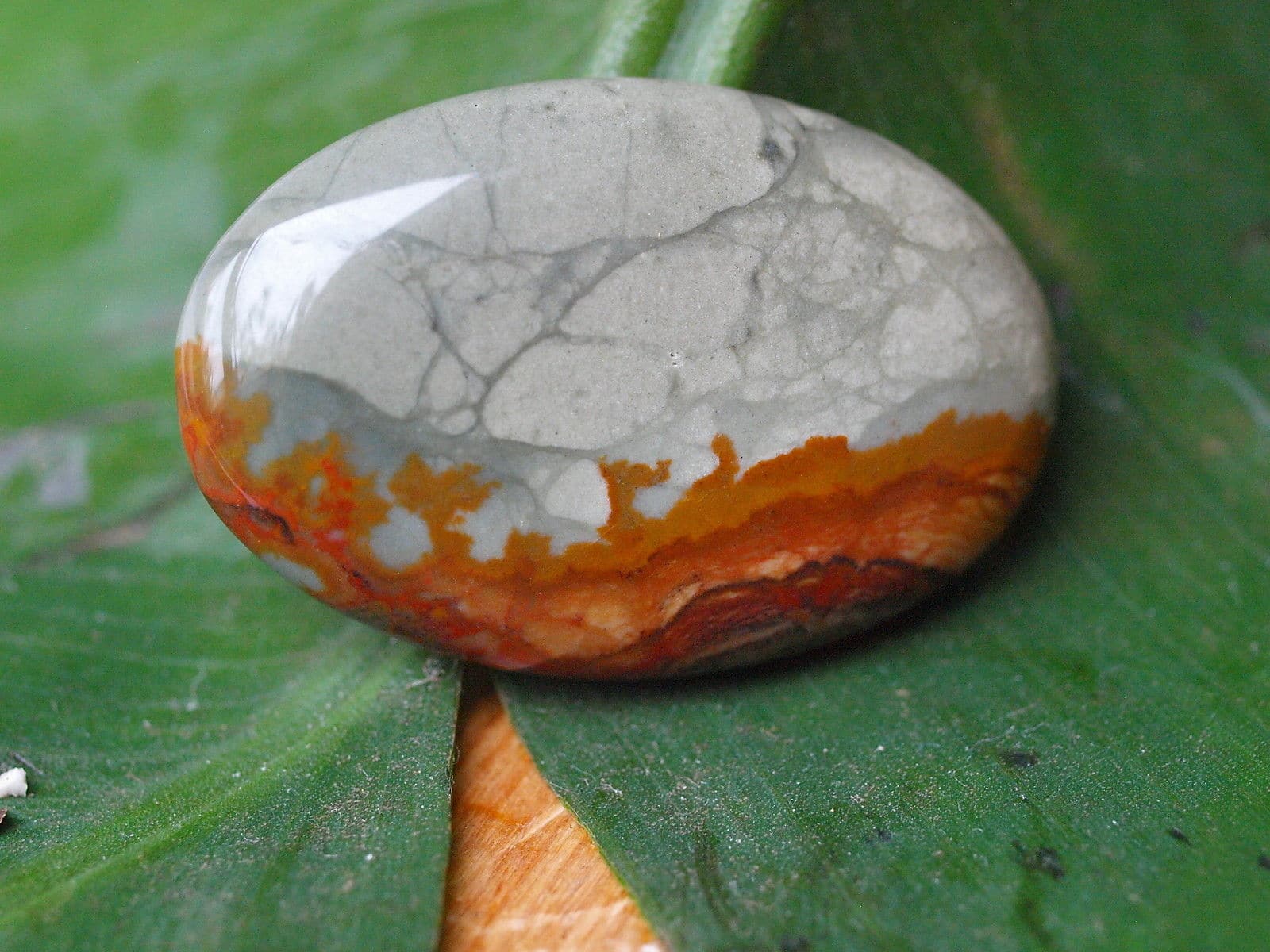 Landschaftsstein Jaspis Anzahl : 1 Schliff : oval Grösse : 6,4 x 26 x 38,5 mm Gewicht : 10,8 Gramm beide Seiten poliert. Schöne Grafik, als Sammler- oder Schmuckstein geeignet. Es handelt sich um echte natürlich gewachsenene Steine, keine Synthesen ! Es wird der abgebildete Stein verkauft.