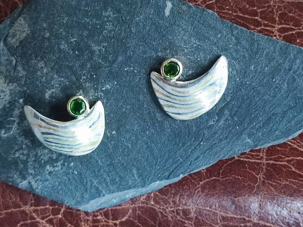 Wirklich einzigartig sind diese Ohrstecker in Mokume Gane Technik mit funkelnd grünen Chromdiopsiden