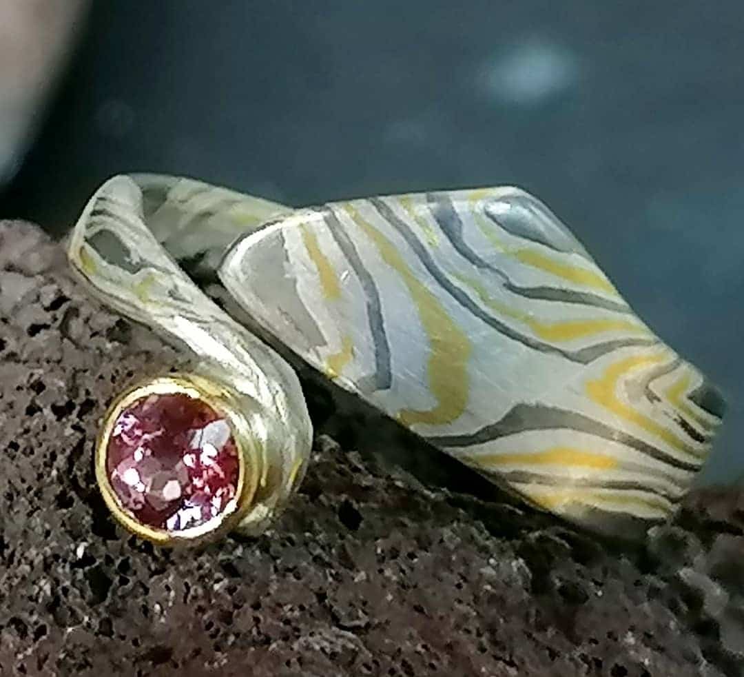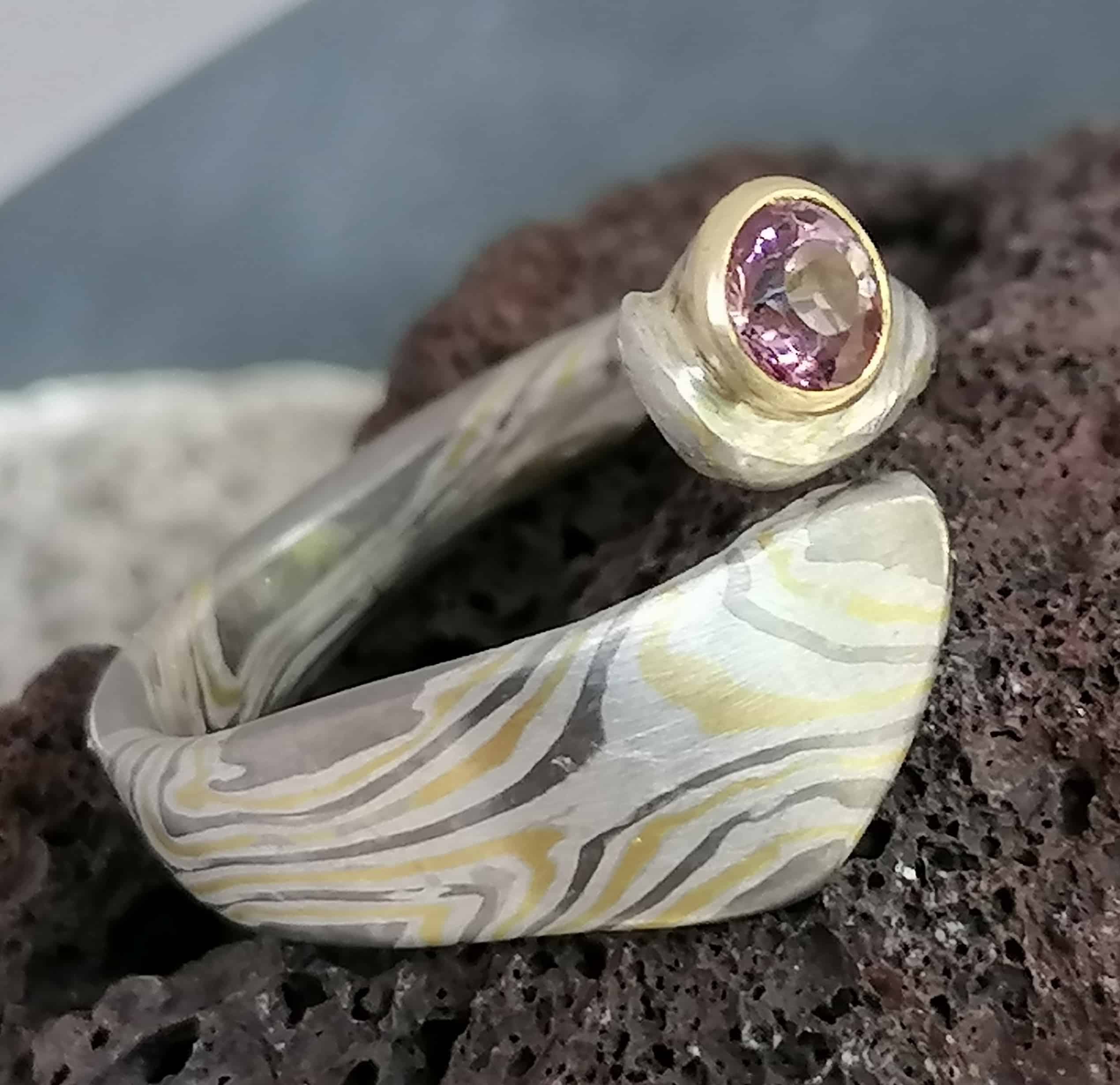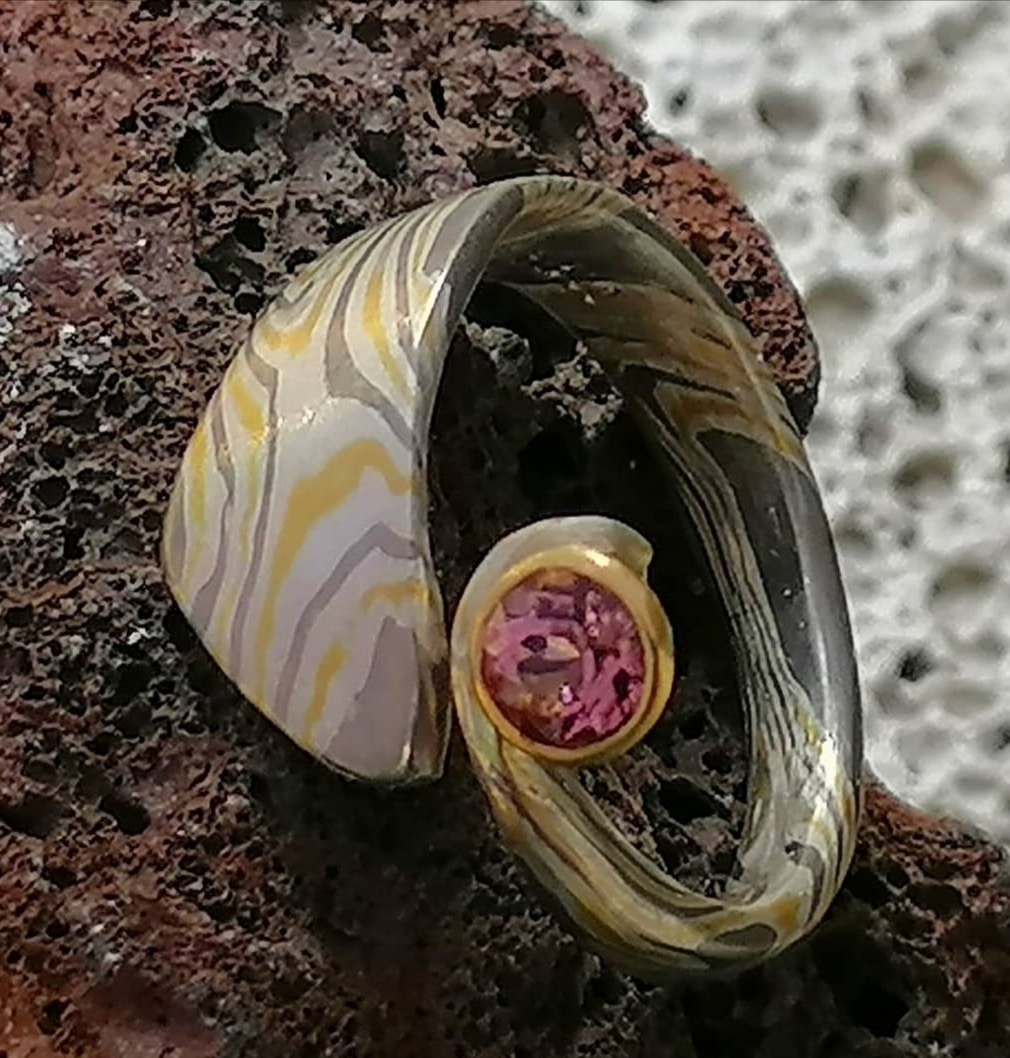 10. November 2018Unikat Ring Mokume Gane pink Saphir Gold 900, Palladium 500 Silber 925 geätzt oder ungeätzt auf Bestellung