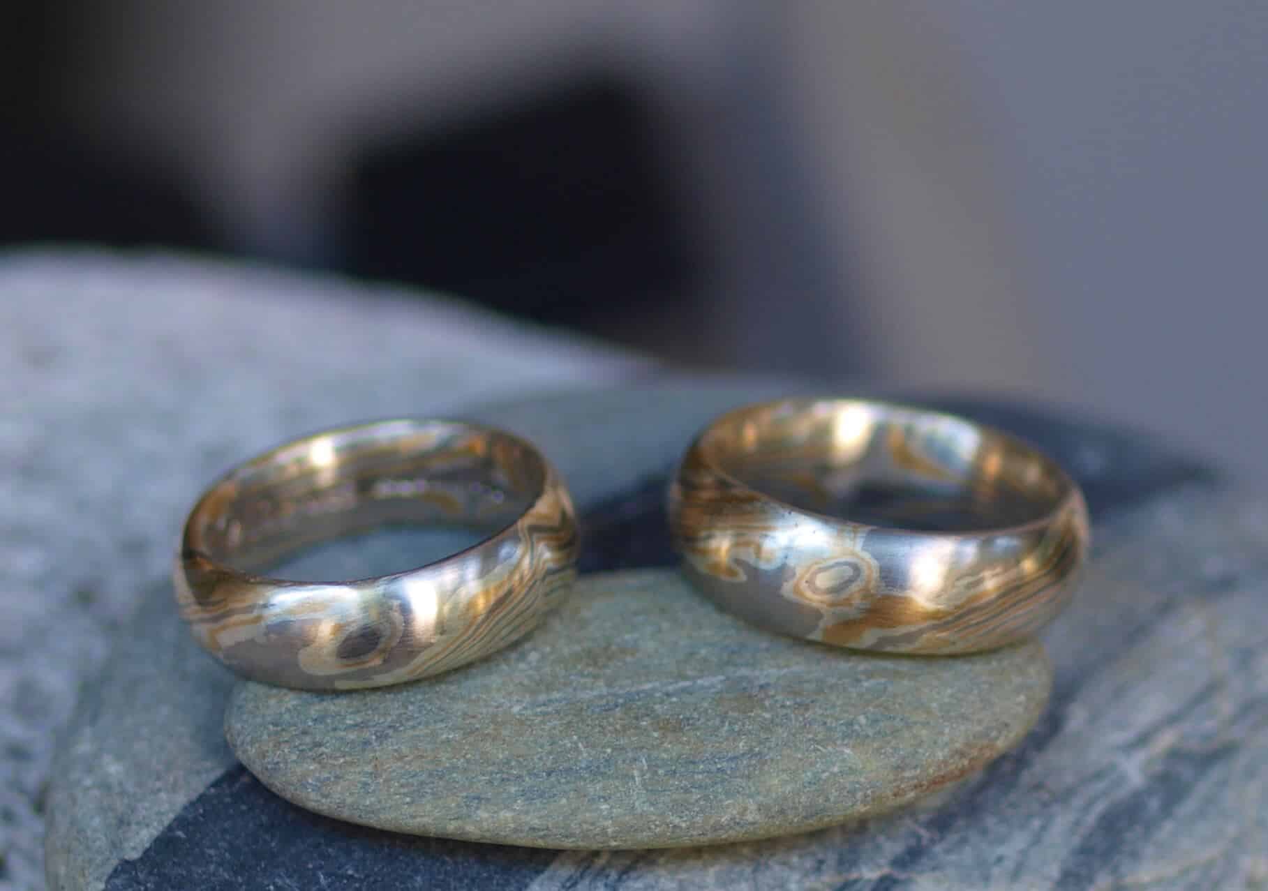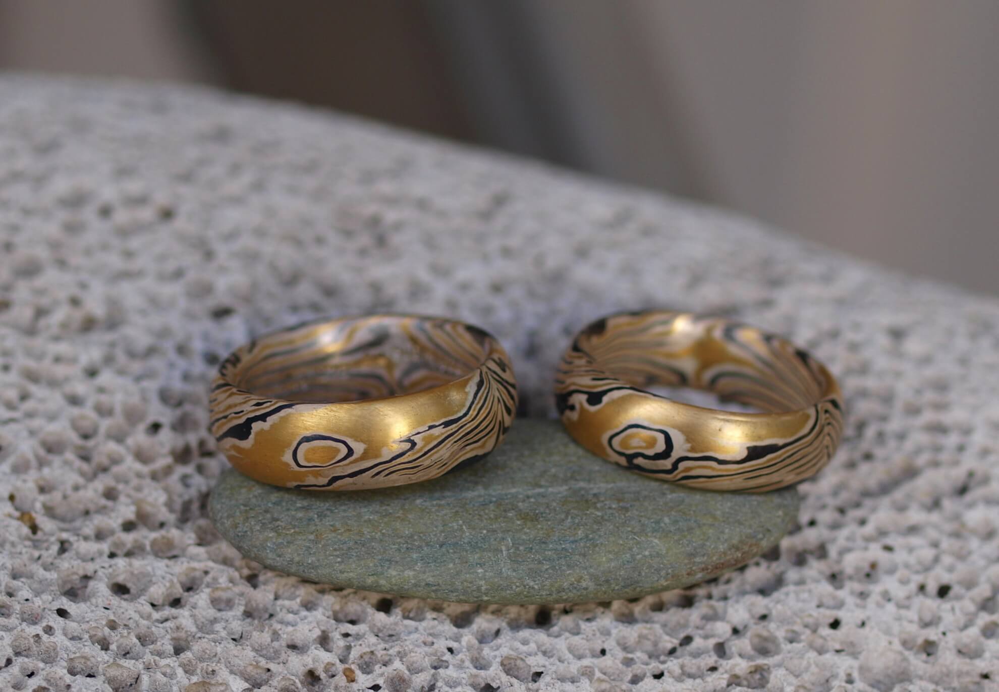 Meine Trauringe werden nach der japanischen Schmiedekunst Mokume Gane mit Ursprüngen im 17. Jahrhundert in meiner Trauringschmiede in Berlin angefertigt. Die traditionelle Technik wurde zunächst nur in Japan als gut gehütetes Geheimnis über Generationen hinweg weitergegeben und erreichte Deutschland erst vor einigen Jahrzehnten. Mokume Gane besteht aus zahlreichen aufwendigen Verfahren. Das Beherrschen unterschiedlicher Praktiken und Vorgänge sowie viel Fingerspitzengefühl und vor allem Erfahrung im Gebrauch der hochwertigen Materialien wie Palladium, Silber, Gold und auch Platin sind Voraussetzung bei der Mokume-Gane-Technik. Die verwendeten edlen Werkstoffe werden – individuell nach Ihren eigenen Wünschen und Vorstellungen – geschichtet und gemischt. Der sinnbildliche Name Holzmaserung in Metall steht für ein so entstehendes kontrastreiches Muster, das dem Ring sein charakteristisches Aussehen verleiht. Mit dieser Optik ausgezeichnet, erscheint das entstandene Produkt sowohl zeitlos als auch modern zugleich. Durch die verwendete Technik und der von Ihnen ausgewählten Edelmetalle in unterschiedlichen Farben ist keines der Schmuckstücke reproduzierbar und bleibt stets ein Unikat. Ihr einzigartiges Mokume-Gane-Schmuckstück aus meiner Trauringschmiede Berlin wird natürlich auf Ihre persönlichen Größen angepasst.
